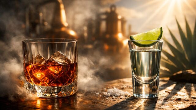 蒸留酒 ウイスキーとテキーラの違いとは?強さの比較と悪酔いしない飲み方 kotaro Booze Realm パーティーシーンでショットグラスを傾ける陽気なイメージのテキーラと、静かなバーで氷の音を楽しみながら味わうウイスキー。この二つのお酒は、ウイ …