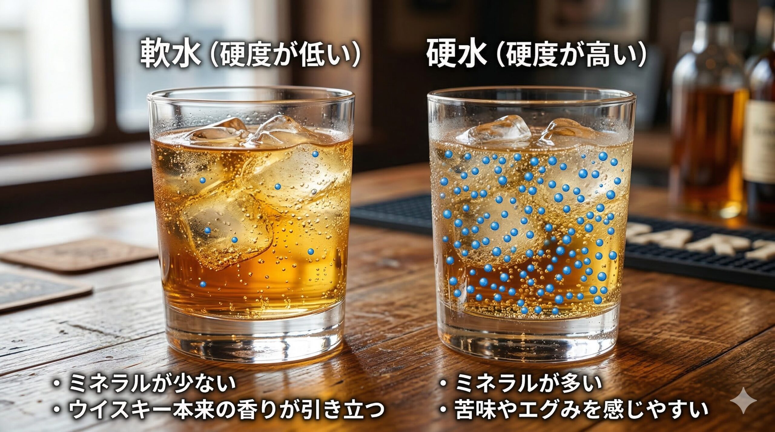 日本のウイスキーの多くは軟水で仕込まれているため、同じ軟水ベースの割り材を選ぶことで、ウイスキー本来の繊細な香りや甘みが見事に調和します。